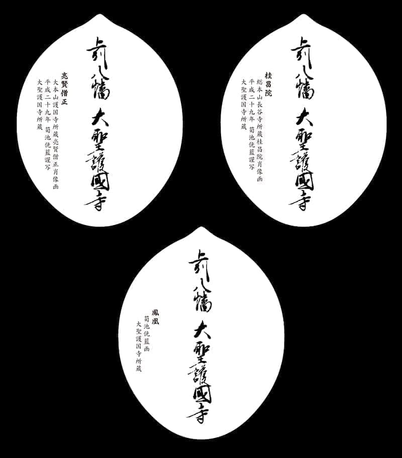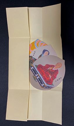 掛け軸等のお写真をお送りいただき、画像として散華にレイアウトいたしました。記念のお品物で大きめで厚めの用紙をご希望でしたので、弊社で一番幅のある散華型を使用し、220kgのしっかりとした用紙で散華作製をいたしました。